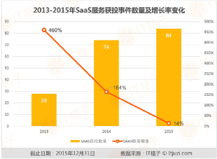 2015年,常常被媒体称为中国SaaS元年。首先是2014~2015年的SaaS融资消息频出。根据IT桔子的数据,2014年SaaS融资74起,是2013年的2.6倍;2015年SaaS融资84起,融资金额估计近40亿,是2013年的10倍,如下图所示。